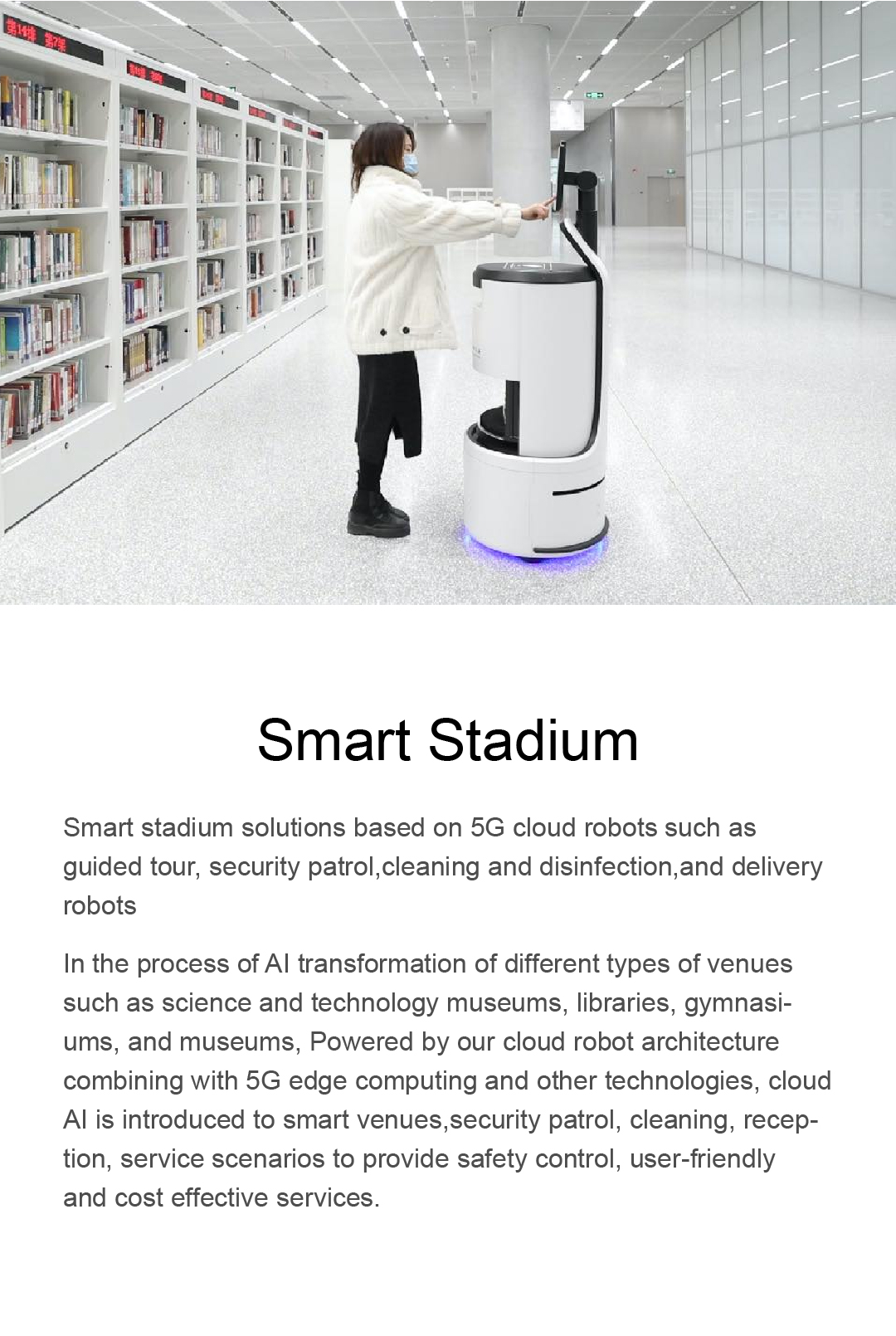 Smart stadium solutions based on 5G cloud robots such as guided tour, security patrol,cleaning